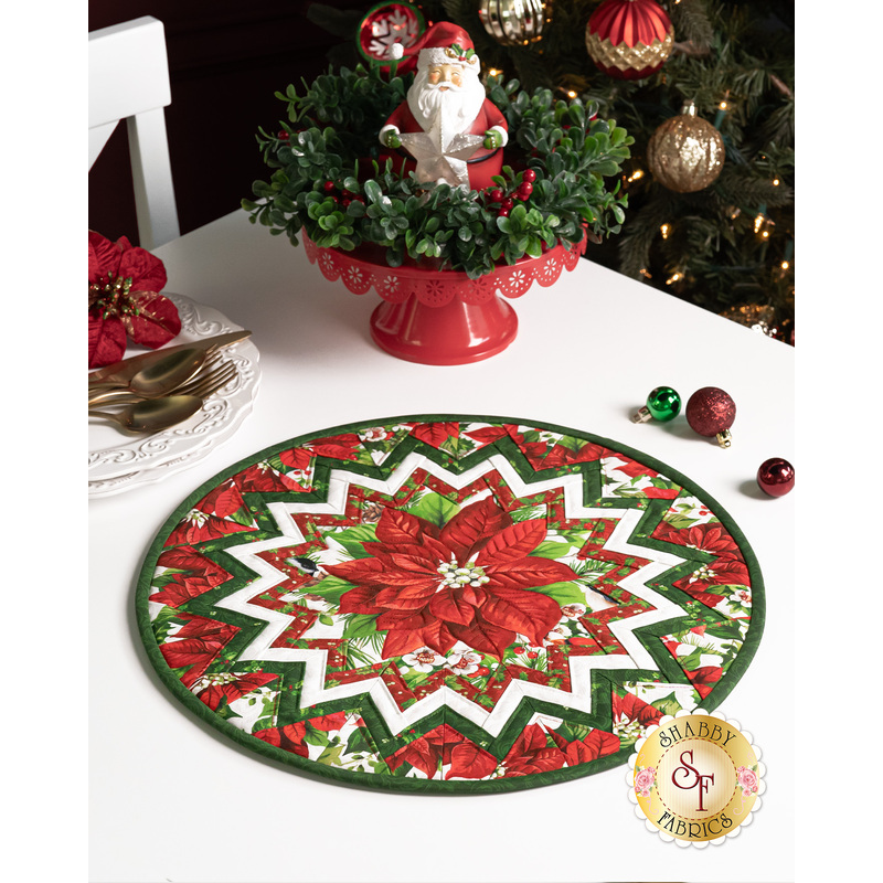The Point of View Folded Star Table Topper is a unique centerpiece for your table, designed by PlumEasy using the elegant Yuletide Traditions collection from Northcott Fabrics. The center "point of view" features a beautiful red poinsettia, surrounded by layers of prairie points in coordinating fabrics. Enjoy displaying this eye-catching table topper in your home.