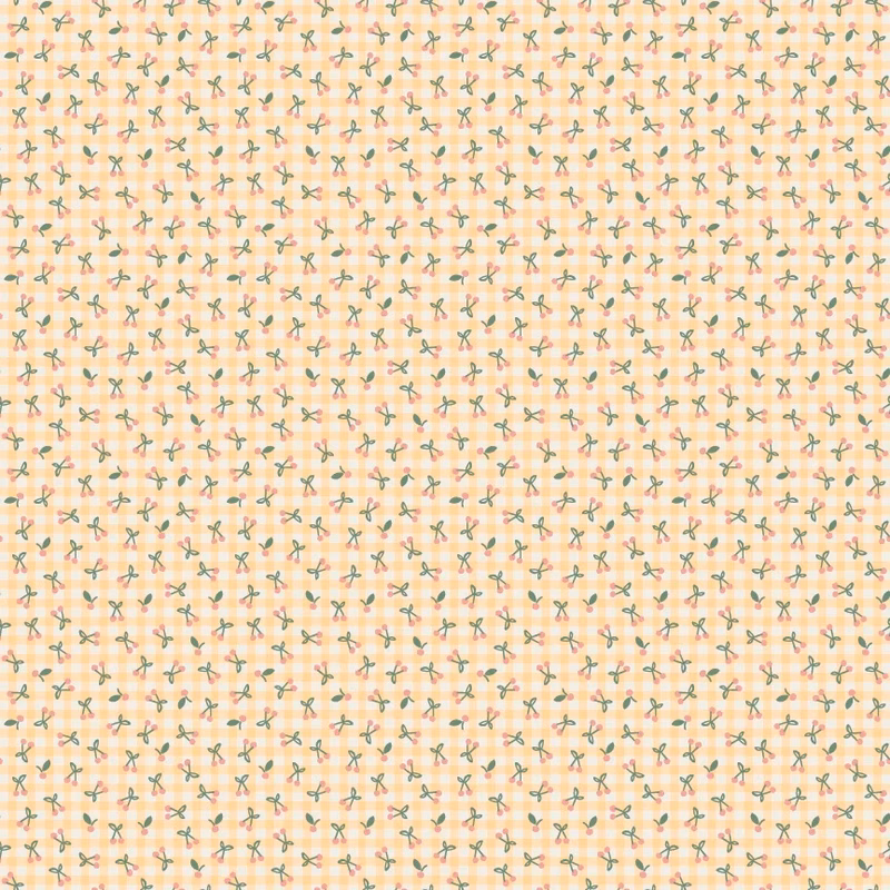 Capture the essence of country living with the whimsical Farmhouse Fancy collection by Poppie Cotton. Add a touch of sweetness to your sewing projects with this yellow gingham fabric adorned with a charming ditsy pattern of light pink cherries.